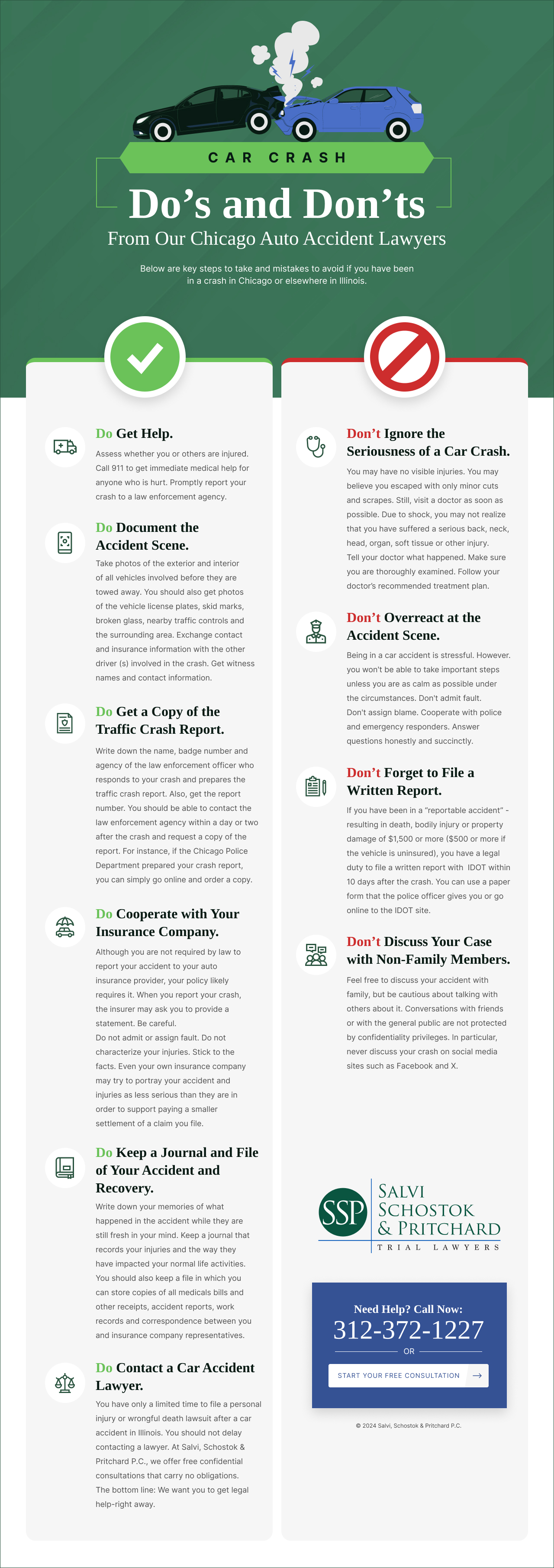 At Salvi, Schostok & Pritchard P.C., we believe it is crucial to conduct an immediate, thorough investigation of a car wreck so as to ensure that no evidence is lost or destroyed. It is critical that you contact a Chicago car accident attorney immediately about your car accident claim.