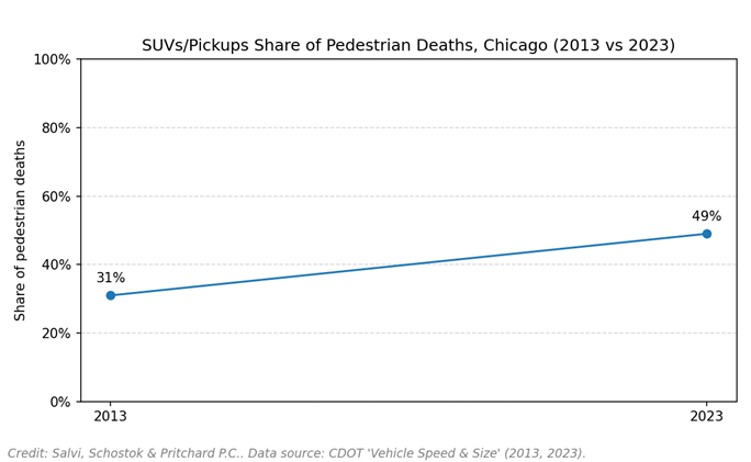 In 2023, 46 pedestrians and 10 bicyclists were killed in Chicago crashes, according to Illinois’ Department of Transportation totals. More than half of pedestrian fatalities, roughly 55%, were caused by hit-and-run drivers — over twice the U.S. average of 24%, according to the City’s Reckless Driving Data Portal. About half of the pedestrians killed were struck by SUVs or larger vehicles, according to additional City data, up from roughly a third a decade ago.